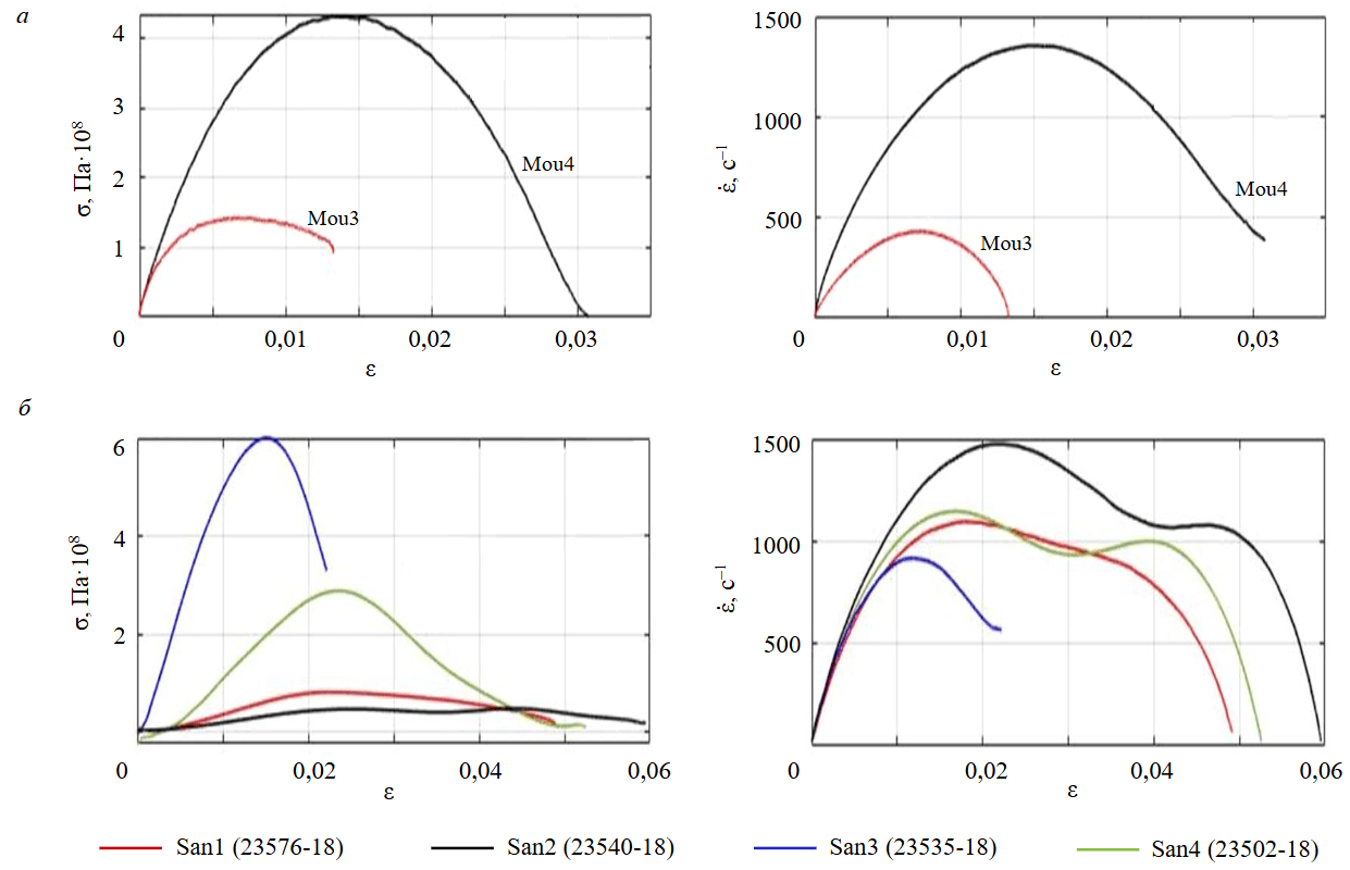 Динамическое нагружение образцов (песчаник, андезит) проводилось в условиях сохранения фрагментов и реализовывалось на модифицированной установке разрезных стержней Гопкинсона (РСГ-25) (лаборатория физических основ прочности, ИМСС УрО РАН, Пермь). Параметры эксперимента (длина и скорость ударника) выбирались такими, чтобы максимально достижимое давление на образец (определяемое скоростью ударника) и максимально достижимая деформация (определяемая скоростью и длиной ударника) гарантированно позволяли разрушить образец. Для оценки этих величин использовались данные квазистатического нагружения. Динамическое нагружение образцов андезита (Mou3, Mou4) проводилось при разных скоростях ударника – 9,8 и 20,8 м/с. При достижении максимальных значений напряжений для Mou3 (нагружающее напряжение σ = 143 МПа, деформация ε = 7,5·10–3) скорость деформации ε· равнялась 430 с–1, для Mou4 (σ = 428 МПа, ε = 15,3·10–3) скорость деформации составила 1353 с–1 (рис.5, а). Значение энергии разрушения определялось как площадь под деформационной кривой до σmax для образца Mou3 – 0,84 Дж (из возможных под всей кривой 1,7 Дж), для образца Mou4 – 5,2 Дж (из возможных 9,8 Дж). Поскольку образец Mou3 нагружался с меньшей скоростью ударника, он не был полностью разрушен, но, как показал анализ рентгеновской томографии, был испещрен трещинами по всему объему. Другой образец фрагментировался полностью, проводился анализ статистики его фрагментации. Фрактолюминесценцию данных образцов зафиксировать не удалось, сигналы слабые, несмотря на объемное содержание кварцита в материале.