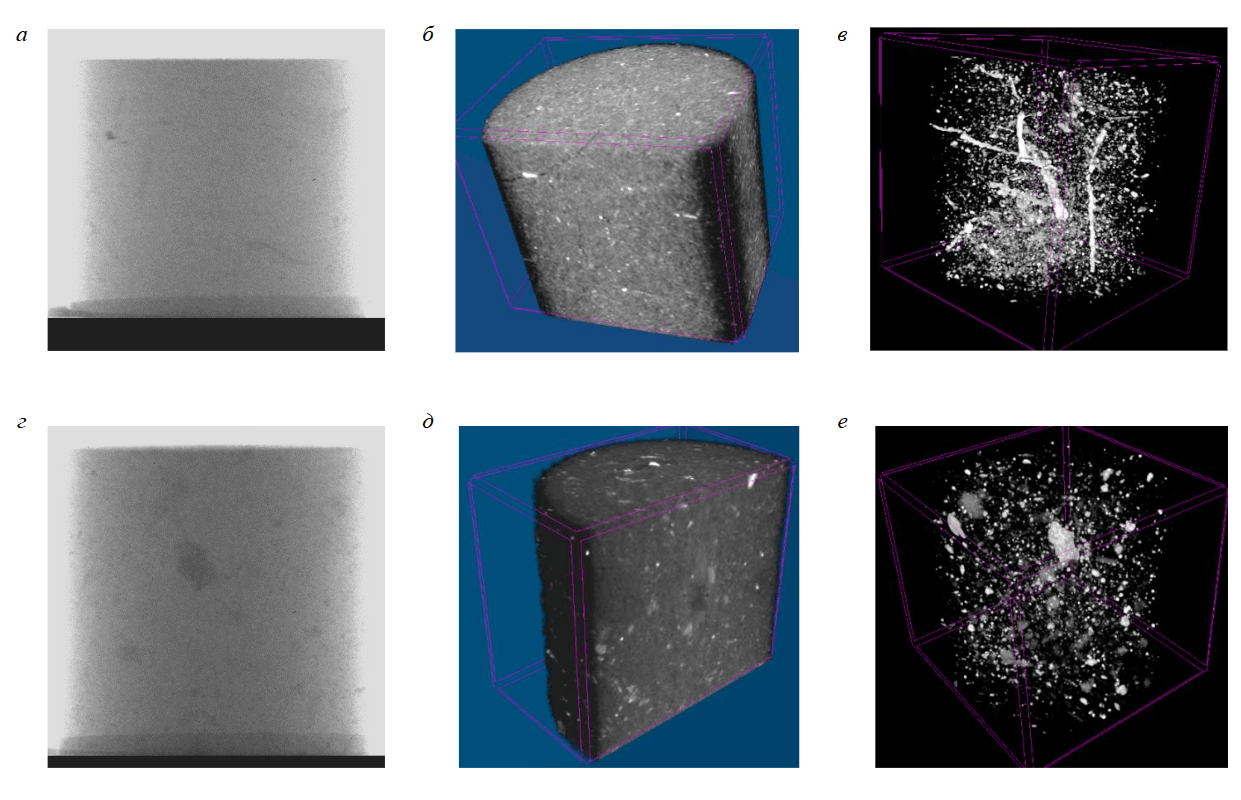 Рис.6. Результаты рентгеновской томографии до нагружения: внешний вид образцов песчаника (San7) и андезита (Mou4) (а, г); изображение их сечений (б, д) и 3D-изображения вкраплений в образцах – серые и белые области (в, е)