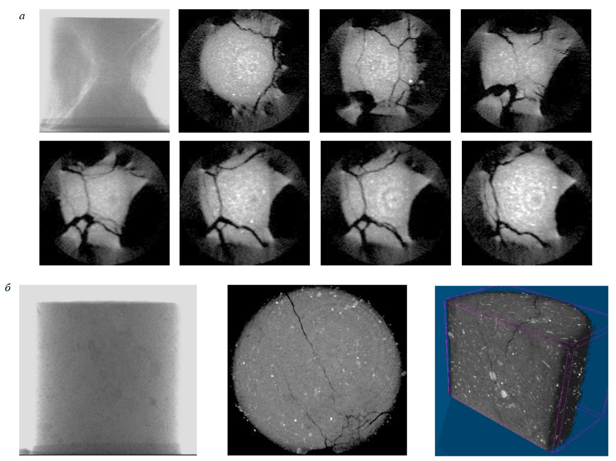 Рис.7. Результаты обработки данных рентгеновского томографа Bruker: а – фотографии образца песчаника San5 и его сечений по высоте с интервалом 1,5-2 мм после квазистатического сжатия; б – изображение образца андезита Mou3 после динамического сжатия (слева направо): вид сбоку, сечение по высоте вблизи верхнего основания, боковое сечение