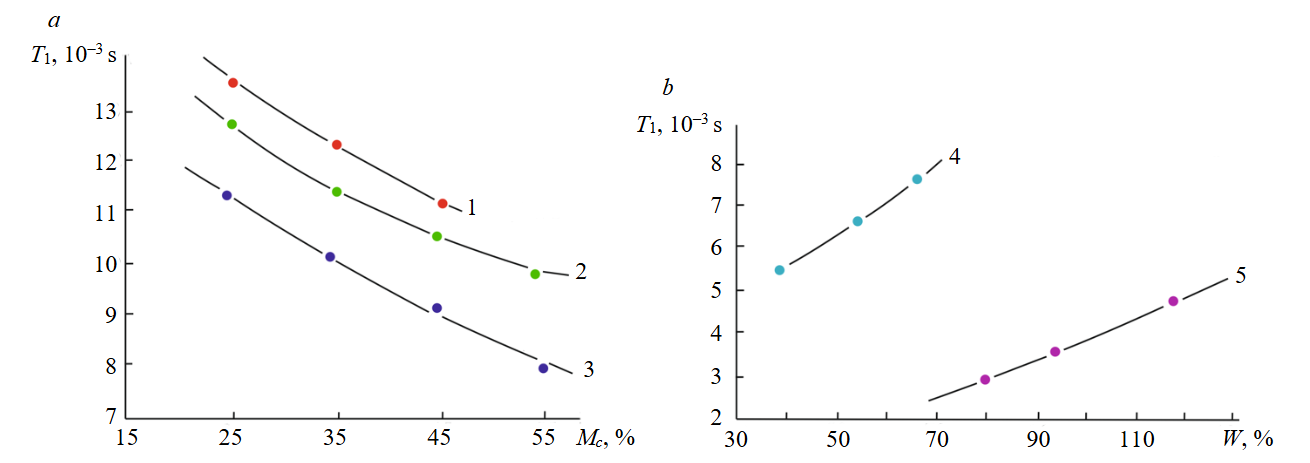 Fig.2. Variation of spin-lattice relaxation time T1 of pore water with clay fraction content Мс and moisture content at liquid limit WL (a) and clay mineral composition (b) [24]