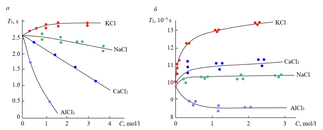 Research into the influence of the cation content in perchlorate salt solutions on water structuring (HClO4 being an anion that does not affect the structure of bulk water) was conducted by V.I.Chizhik [23]. All the studied perchlorate solutions were prepared via fully degassed water, whose spin-lattice relaxation time T1 is approximately 3.5 s, whereas the T1 value of the distillate is slightly lower and is 2.5 s. It has been experimentally established that the T1 parameter decreases approximately threefold in the presence of positive-hydration ions compared with fully degassed water, with the smallest decrease observed in sodium perchlorate solutions and the most significant – in magnesium solutions.