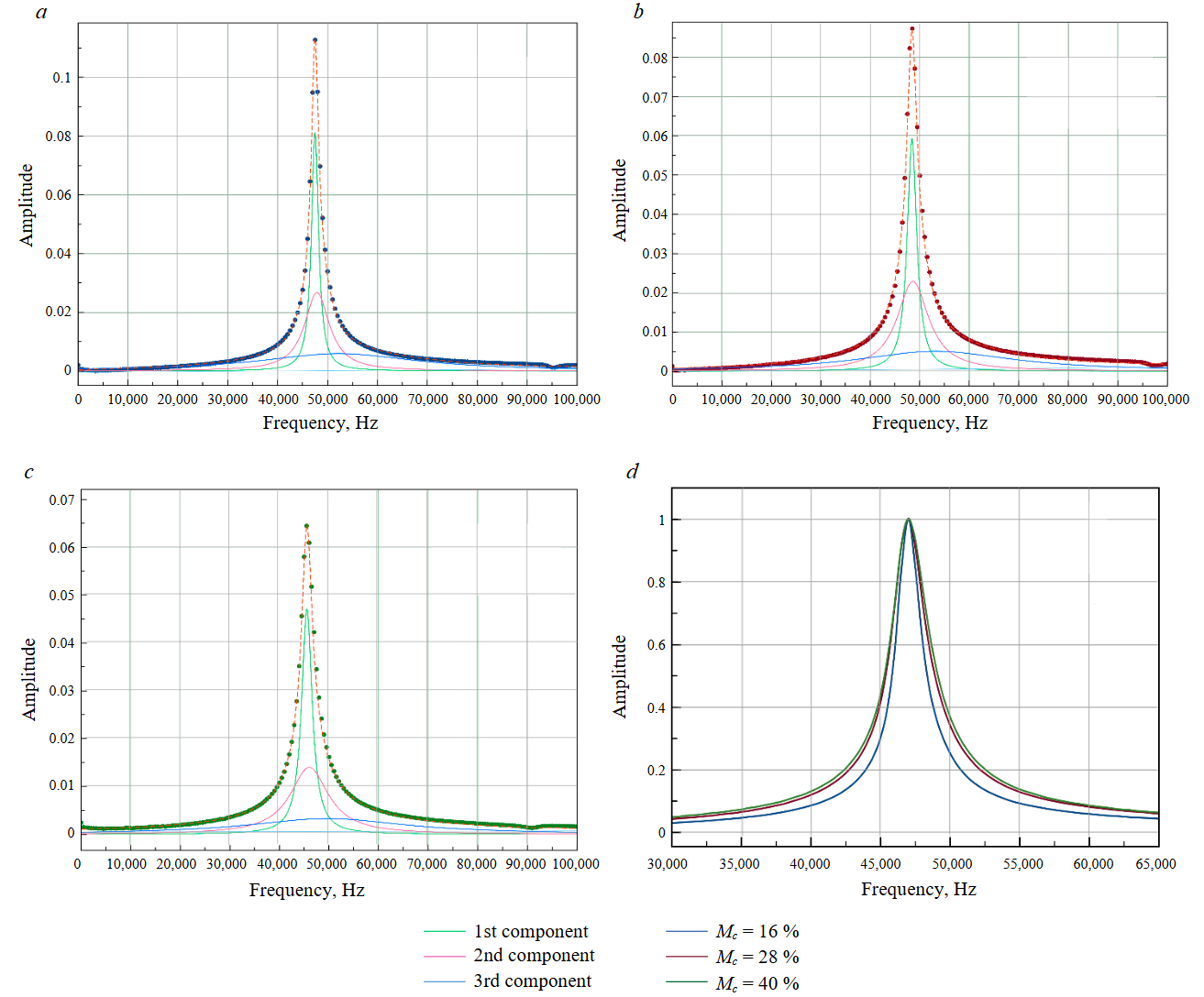 For samples with varying clay fraction contents, free induction decay (FID) signal spectra were recorded following fast Fourier transformation via the ECHO-12 relaxometer (Fig.4, а-c). As the relaxometer receiver employs a synchronous phase detector without quadrature detection capability, all the spectra were acquired with a 47.5 kHz resonance frequency offset at 500 Hz spectral resolution. Figure 4, d displays the superimposed spectra with amplitude-axis normalization.