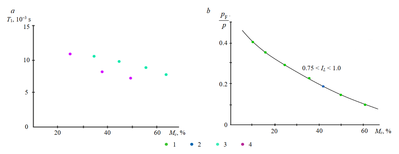 Fig.6. Variation in water structuring degree by Т1 value (a) and relativepore pressure ratio pw/p (b) versus clay fraction content Mс and liquidity index IL
