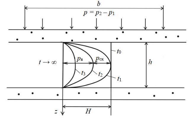 - в любой момент времени t, отличного от нуля, все внешнее давление p =p2 – p1 распределяется на поровую воду pв (поровое давление) и скелет грунта pск (эффективное давление) (рис.1).