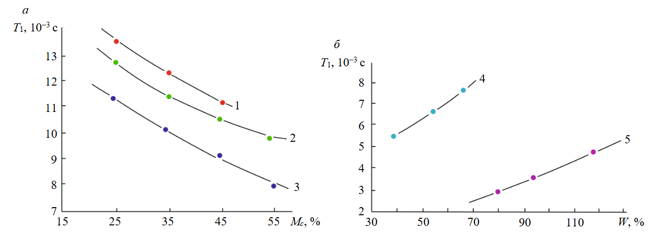 Проведенные исследования показали, что свободная вода при такой вариации состава и состояния глинистых грунтов полностью отсутствует, так как усредненный параметр T1 составляет n·10–3 с по сравнению со свободной водой (Т1= 2,5 с). При этом наибольшее снижение T1 наблюдается при наименьших влажностях (при постоянстве минерального состава) и наличии более активных глинистых минералов группы монтмориллонита (бентонита) даже при весьма высоких влажностях W> 70 %.