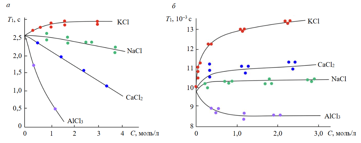 Изучение влияния минерализации и ионного состава поровых растворов на структуру воды показало, что основное воздействие оказывают активные центры глинистых частиц, что подтверждается показателем Т1, измеренным в присутствии отрицательно (K+) и положительно-гидратирующих ионов (Na+, Mg2+, Ca2+, Al3+), при этом значения T1 остаются в пределах n·10–3 с.
