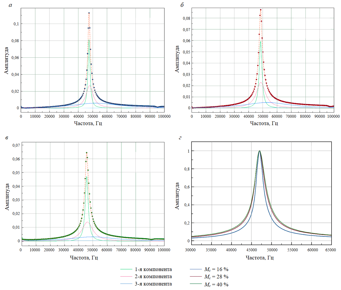 Для образцов с различным содержанием глинистой фракции были записаны спектры сигналов спада магнитной индукции FID (free induction decay) после быстрого преобразования Фурье на установке ЭХО-12 (рис.4, а-в). Так как приемник релаксометра использует синхронный фазовый детектор и не имеет возможности квадратурного обнаружения, все спектры были записаны со смещением от резонансной частоты на 47,5 кГц с разрешением спектра 500 Гц. На рис.4, г показан совмещенный спектр сигналов с нормировкой по оси амплитуды.