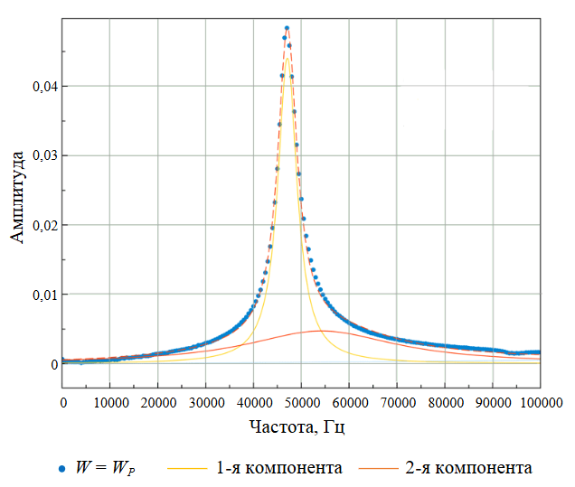 Структура воды для водонасыщенного глинистого образца (Mс = 40 %) определялась при влажности, близкой к W = WP = 26 %. Значения параметра T1, определенного на установке ЭХО-12, варьировали от 4,76 до 9,62 мс. Более узкий диапазон изменения T1 может быть объяснен наименьшим диаметром пор и большим влиянием эпитаксиальных центров на структурированность поровой воды по сравнению с поляризующими. При анализе полученного спектра сигнала выделяются лишь две компоненты, в том числе кристаллизационная вода в структуре глинистого минерала (19 кГц) и единая компонента, характеризующая адекватность структуры поровой воды в грунте (рис.5).