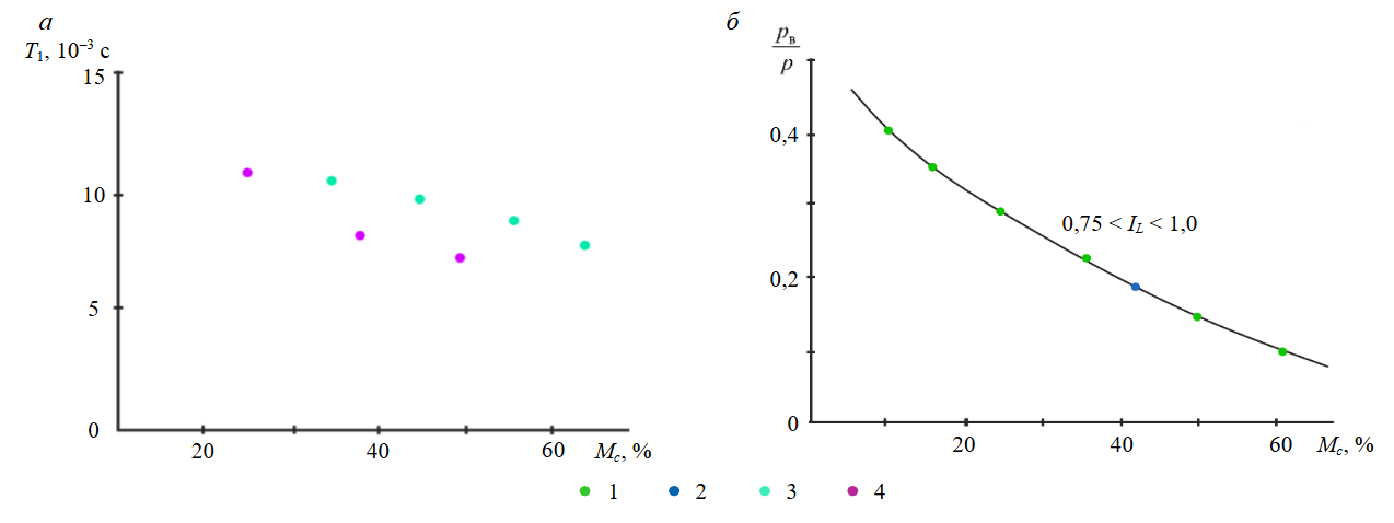 Рис.6. Закономерность изменения структурированности воды по значению Т1 (а) и относительной величины порового давления pв/p (б) от содержания глинистой фракции в грунтах Mс и показателя текучести IL