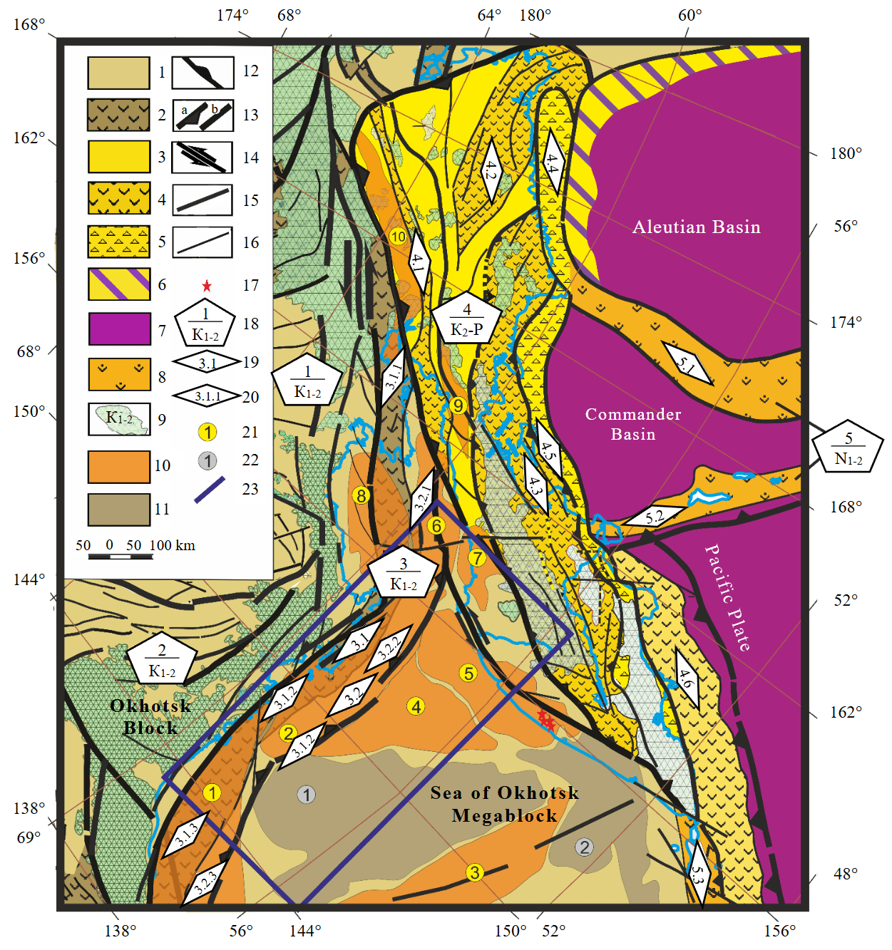 Structures of consolidated basement: 1 – Kolyma-Omolon FA; 2 – Verkhoyansk-Kolyma FA; 3 – Okhotsk-Chukotka collision-active marginal zone: 3.1 – Okhotsk-Chukotka suture zone (3.1.1 – Murgalskii, 3.1.2 – South-Taigonosskii, 3.1.3 – Tauiskii fragments), 3.2 – marginal fold-and-overthrust belt (3.2.1 – Shelikhovskii, 3.2.2 – Primagadanskii, 3.2.3 – Bilibinskii fragments); 4 – Koryak-Kamchatka accretion-collision-active marginal FA (4.1 – West Koryak, 4.2 – Central Koryak, 4.3 – Olyutorskaya, 4.4 – Khatyrskaya, 4.5 – Vetlovsko-Govenskaya, 4.6 – Kronotskaya zones); 5 – island arcs and ridges (5.1 – Shirshov Ridge, 5.2 – Aleutian-Commander, 5.3 – Kuril)