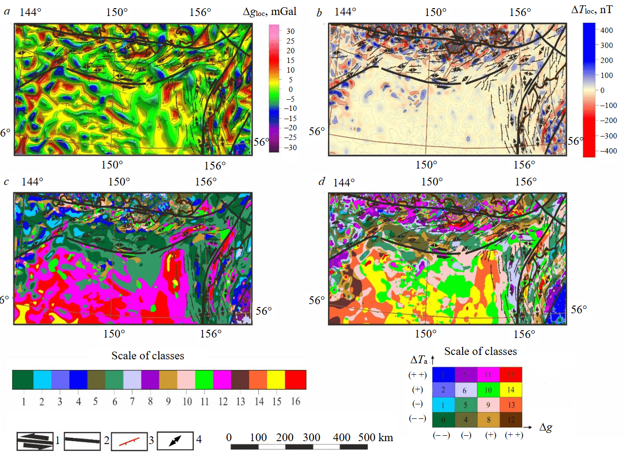 Fig.2. Schemes of local components and reference-free classification of gravity and anomalous magnetic fields in the northern Okhotsk region: local components of gravity (a) and magnetic (b) fields; reference-free classification of gravity and magnetic fields calculated using the algorithm of A.V.Petrov COSCAD 3D [23] (c) and the algorithm of D.S.Zelenetsky ASOD “Air” (d) [19]