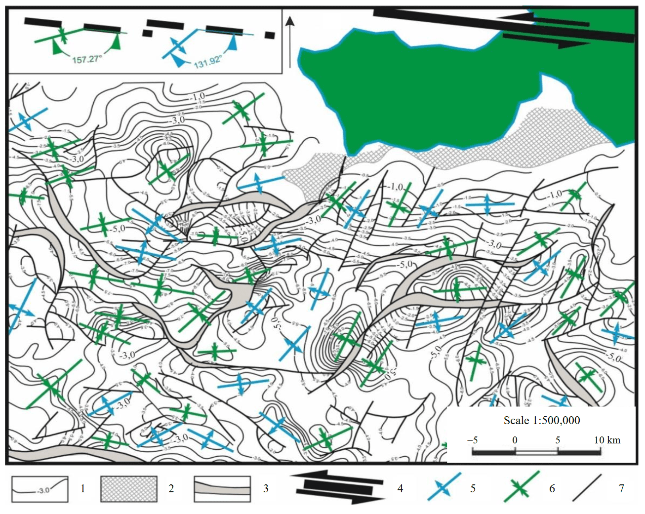 Structures of platform cover. An important source of information on the structure of the sedimentary basins in Northern Okhotsk area and Western Kamchatka were the results of seismic surveying accomplished in the 1980s by OAO Dalmorneftegeofizika. As a result of processing seismic data, by experts of OAO Dalmorneftegeofizika, maps of four reference horizons were compiled corresponding to the main stages of restructuring of the basins [6]. A high quality and detail of these schemes allowed to consider them as a factual basis for assessing the character of tectonic deformations of the basement determining the structure of sedimentary depressions in the region. In order to study feathering dislocations of the principal Okhotsk-Chukotka left-lateral shear, the axes of horst and graben structures were manually drawn in the structure map of the acoustic basement surface (Fig.3), azimuths of the strike of their axial zones were measured, and the number of horsts and grabens, the axes of which are oriented at each ten-degree interval of the half-space, was counted. The results of analysis are displayed in the form of a rose diagram (Fig.4). The constructed rose diagram shows that the principal directions of fault dislocations and, accordingly, sedimentary depressions and horsts have sublatitudinal (azimuth 0-10°) and northwestern (azimuth 160-170°) directions. Dislocations with the strike azimuth 100-120° play a subordinate role. If we focus on parameters of the deformation ellipsoid of the left-lateral shear (Fig.5), then the sublatitudinal strike corresponds to the direction of the Okhotsk-Chukotka shear; north-west is the principal orientation of local horsts and grabens; dislocations with the strike azimuth 100-120°, most likely, represent feathering shears. Taking into account these conclusions and relying on results of a qualitative interpretation of geophysical fields, we constructed the geological scheme and the flow chart, where horsts and grabens of the platform cover are designated, the boundaries of which were differently oriented extension, compression faults and normal faults, the character of changes in the thickness of the Cenozoic cover was established and large sedimentary basins and local structures were outlined (Fig.5).