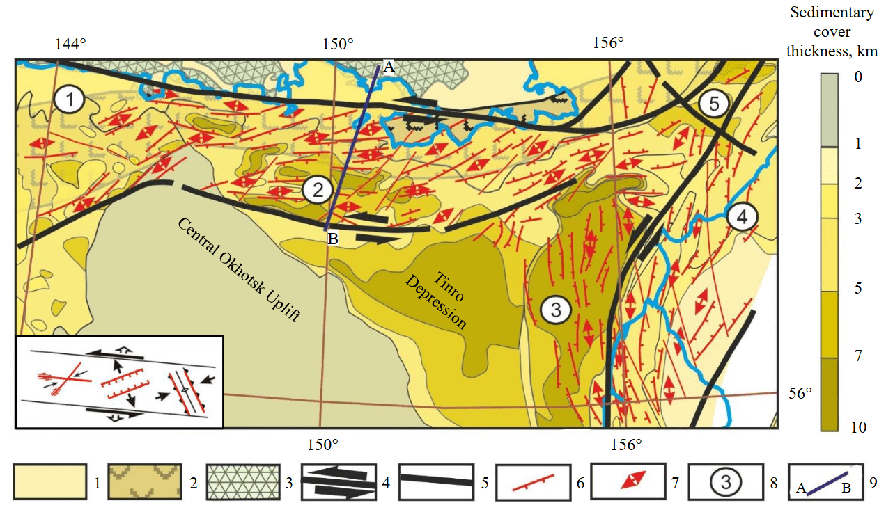 Structural and material units: 1-3 – structures of Cimmerian fold areas (1 – blocks with continental crust, 2 – interblock suture zones, 3 – volcano-plutonic belt); 4 – main regional shears; 5 – faults-boundaries of structural zones; 6 – faults feathering regional shears (normal faults, shears); 7– axes of shear-pull-apart sedimentary cover structures; 8 – elements of oil and gas geological zoning (1 – Shantar-Lisyanskii Trough; 2 – North Okhotsk Trough; 3 – Okhotsk-West Kamchatka Trough; 4 – Voyampolskii Trough; 5 – Shelikhovskii Trough); 9 – position of geological and geophysical profile
