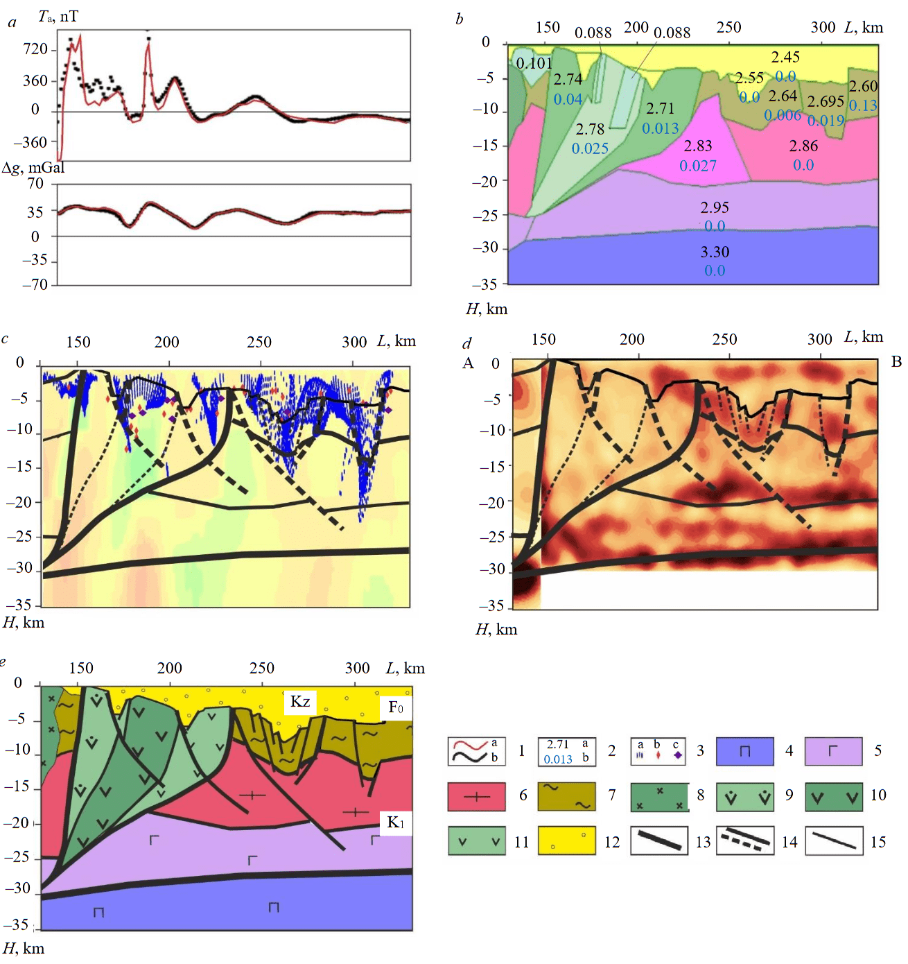 Fig.6. Construction of geological and geophysical section along A-B profile according to materials of interpretation of a set of geophysical data (see the position of the line in Fig.5): a – curves of anomalous magnetic ΔTа and gravity Δg fields; b – petrophysical model; c – “special” points of potential fields; d – seismic CDP section in reflectivity indicators; e – interpretation geological and geophysical section [19]