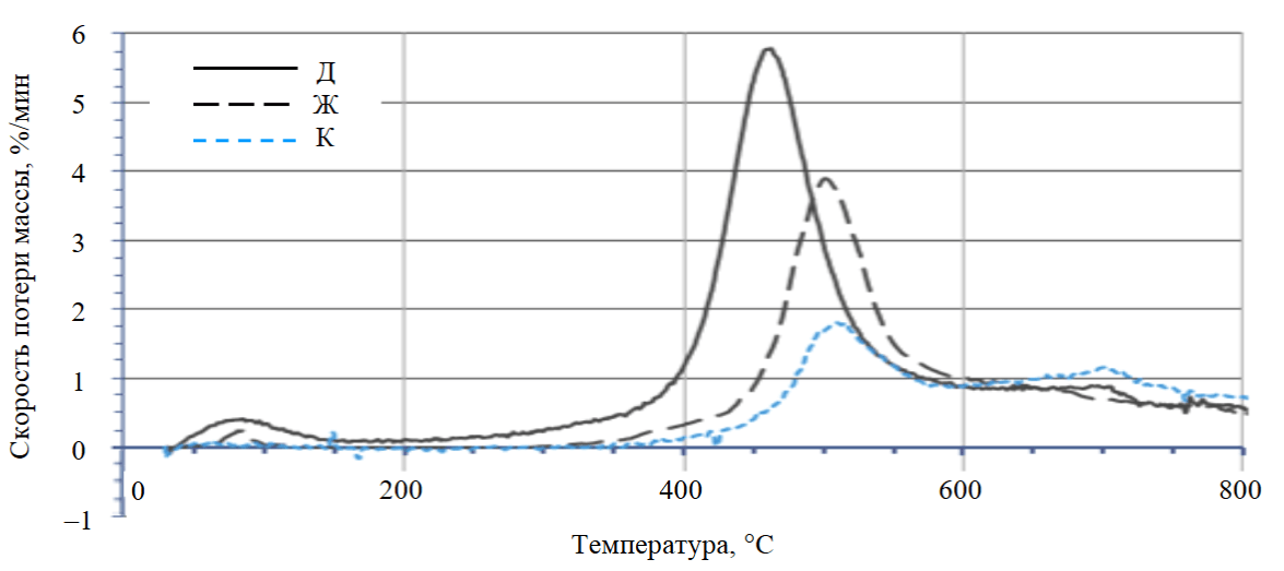 Сопоставлялись ТГ- и ДТГ-кривые проб пылей углей различных марок, а также смеси «уголь – известняк» в состояниях «до взрыва» и «после взрыва», полученные по итогам термогравиметрических исследований, что позволило выявить значимые и качественные различия в функциях и выделить температурные диапазоны выхода летучих веществ [45].