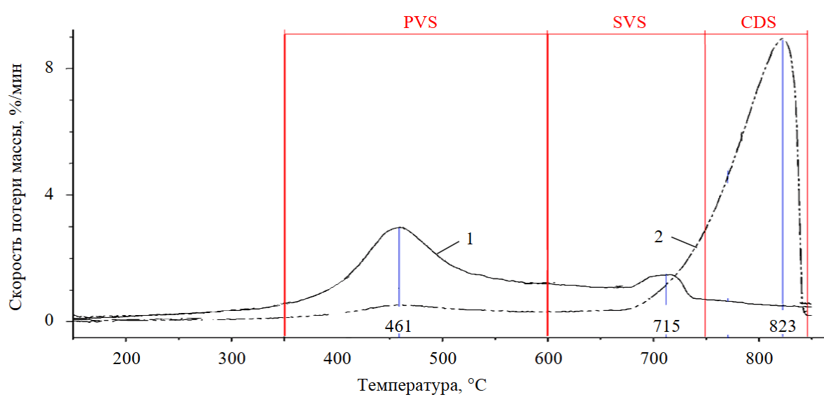На рис.2 представлен процесс выхода летучих веществ из угля марки Д (кривая 1 с PVS-, SVS-стадиями), а также кривая 2 для смеси «уголь – известняк» в соотношении 10:90 %. Для кривой 2 стадии PVS и SVS слабо выражены по отношению к кривой 1, так как процентное содержание угля незначительно и, соответственно, процентный выход горючих летучих веществ в смеси существенно сокращен. Для образца 2 основная часть термодеструкции проходит на стадии CDS при термическом разложении СаСО3 с выходом негорючих летучих веществ СО2.