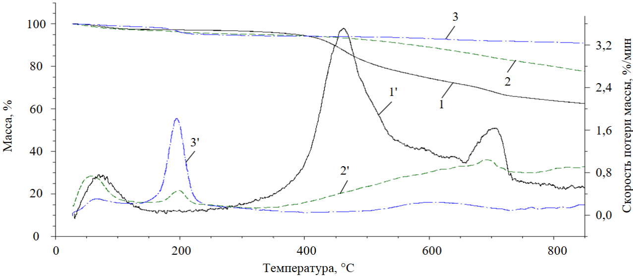 Рис.3. Термогравиметрические функции для проб пыли угля марки Д, отобранных до и после взрыва [45]: ТГ-(1) и ДТГ-(1') кривые угля марки Д до взрыва; ТГ-(2) и ДТГ-(2') кривые угля марки Д после взрыва при концентрации пыли 500 г/м3; ТГ-(3) и ДТГ-(3') кривые угля марки Д после взрыва при концентрации пыли 100 г/м3
