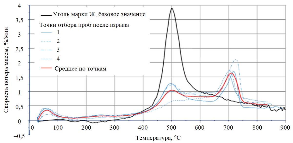 На рис.4 приведен сопоставительный ТГ-анализ базовых проб угля марки Ж и угля после аварийного взрыва пыли на шахте, отобранных в четырех точках (всего отобрано и обработано 18 проб с данной шахты по трем выработкам аварийного участка, 2013). Рассмотренные точки отбора проб (1-4) соответствуют местам смертельного травмирования горнорабочих при взрыве и расположены в следующих местах выемочного участка (ВУ): 1 – в 100 м за лавой в поддерживаемой выработке, в выработанном пространстве (исходящая струя); 2 – в 50 м от лавы; 3 – в 20 м от сопряжения с конвейерным штреком (КШ) нижней части лавы; 4 – в КШ на расстоянии 30 м от сопряжения с лавой на свежей струе. При этом первоначально предполагалось, что взрыв произошел в лаве, однако методом ТГ-анализа было определено, что взрыв произошел за пределами ВУ – в транспортном уклоне, что подтверждено результатами экспертных работ.