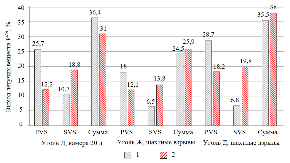 Рис.5. Соотношение динамики выхода летучих веществ для образцов угольной пыли до взрыва (1) и после взрыва (2) на различных стадиях нагрева (PVS, SVS) и суммарного выхода летучих веществ (состояние угольного вещества – daf)