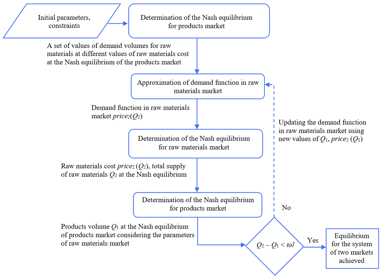 Proposed solution. The algorithm for finding an equilibrium state between interconnected raw materials and products markets looks as follows: