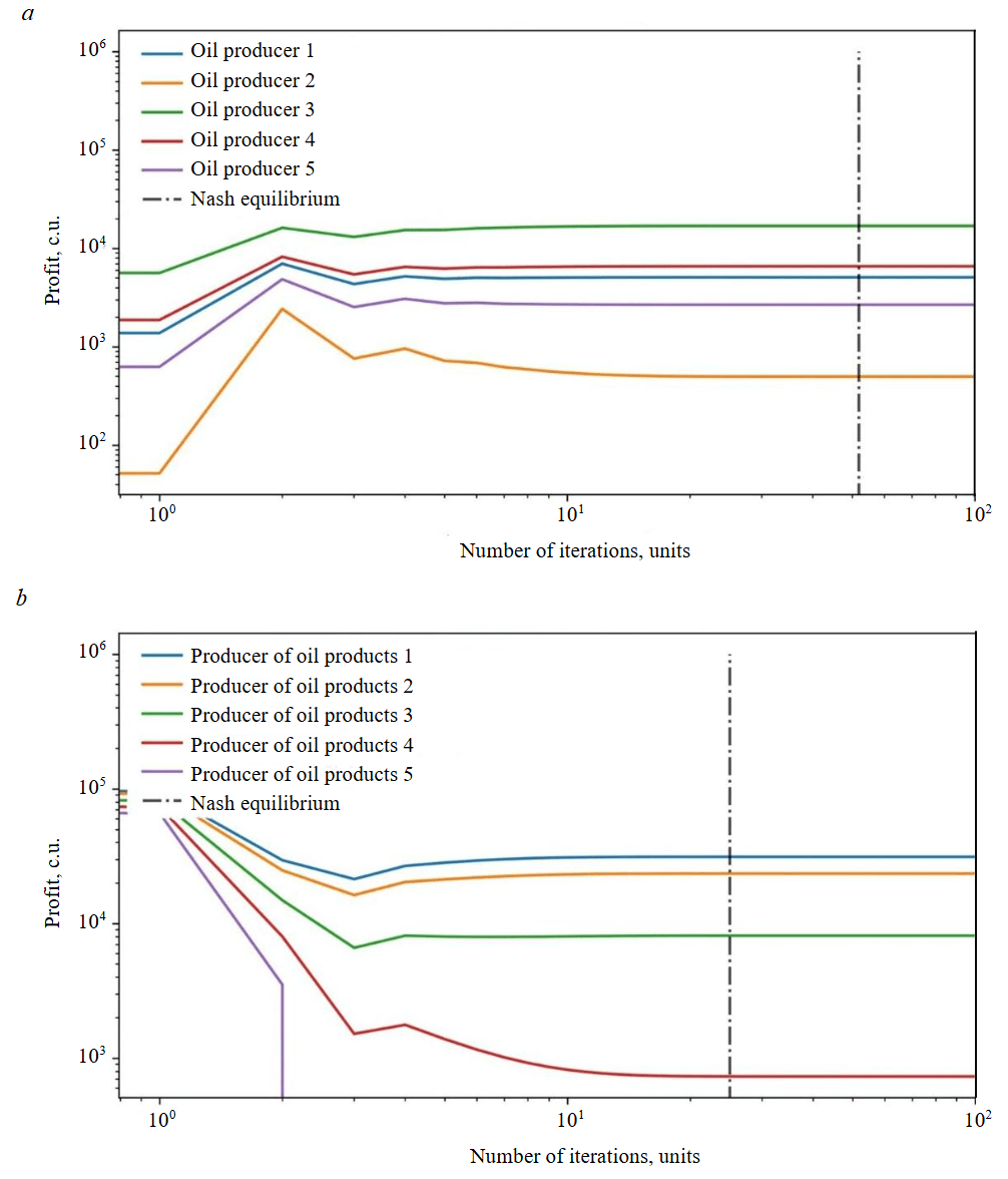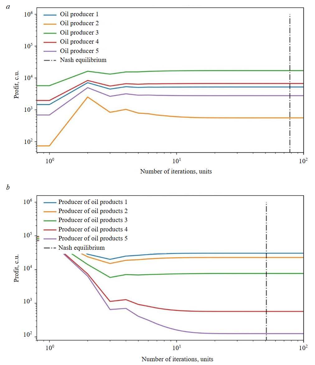 Fig.5. Results of search for the Nash equilibrium for oil – raw materials market (a) and oil products – products market (b) for market scenario N 2