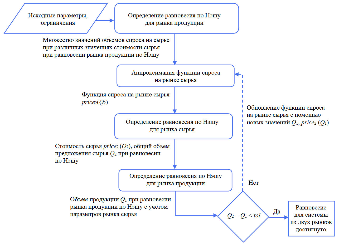 Предлагаемое решение. Алгоритм поиска равновесного состояния между взаимосвязанными рынками сырья и продукции выглядит следующим образом: