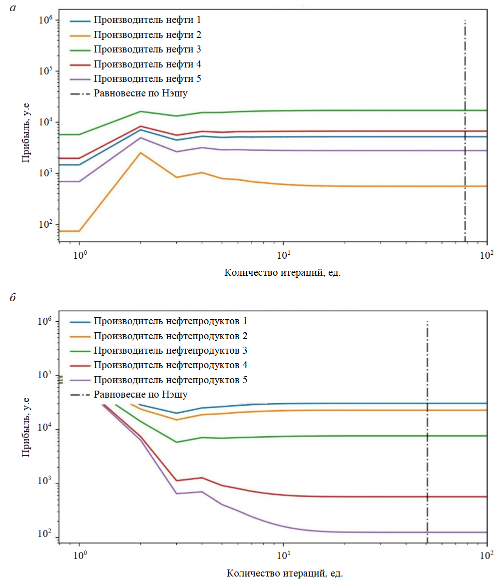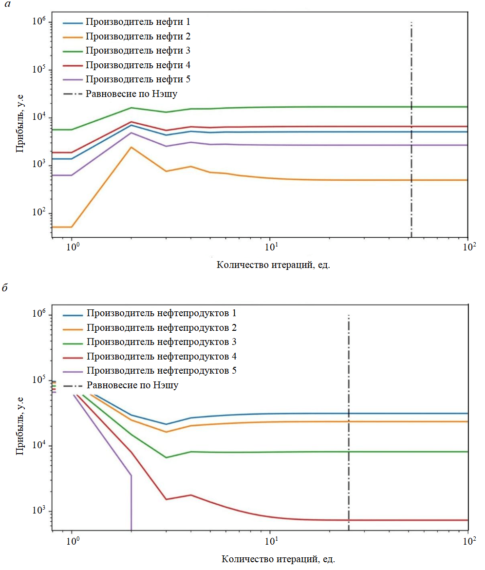 Рис.5. Результаты поиска равновесия по Нэшу для рынка нефти – сырья (а) и рынка нефтепродуктов – продукции (б) для рыночного сценария № 2