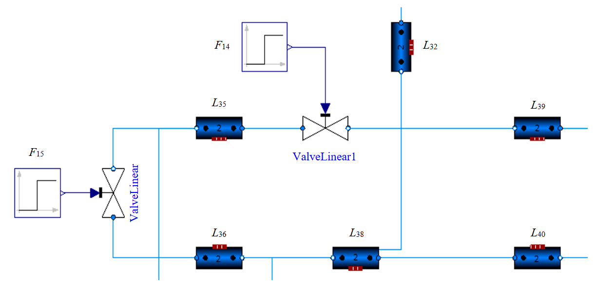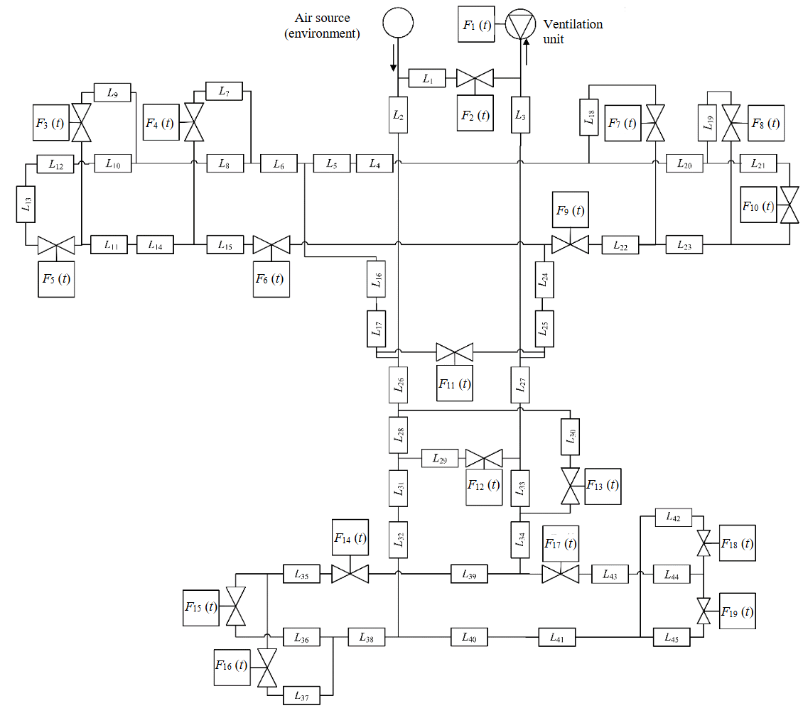 The presented graphical scheme of the ventilation control process for the digital twin simulation subsystem in OpenModelica includes components described in the Table. Each element is a software object from the Fluid library, which contains components for modeling air, liquid, and steam flows. Each software object implements specific physical behavior and has interfaces for interacting with other objects to receive and transmit computed values. The objects are described by corresponding differential equations, interconnected to form a system of 8170 equations, solved by the OpenModelica environment during the simulation of the ventilation process.