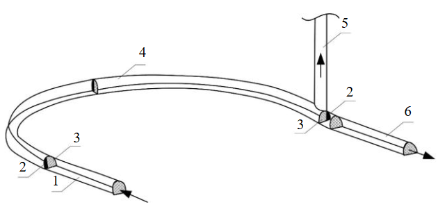 Fig.3. Ventilation of the inclined block of an oil mine using a heat-insulating partition: 1 – slope; 2 – non-working part of the drill gallery; 3 – working part of the drill gallery; 4 – drill gallery; 5 – ventilation shaft; 6 – walkway