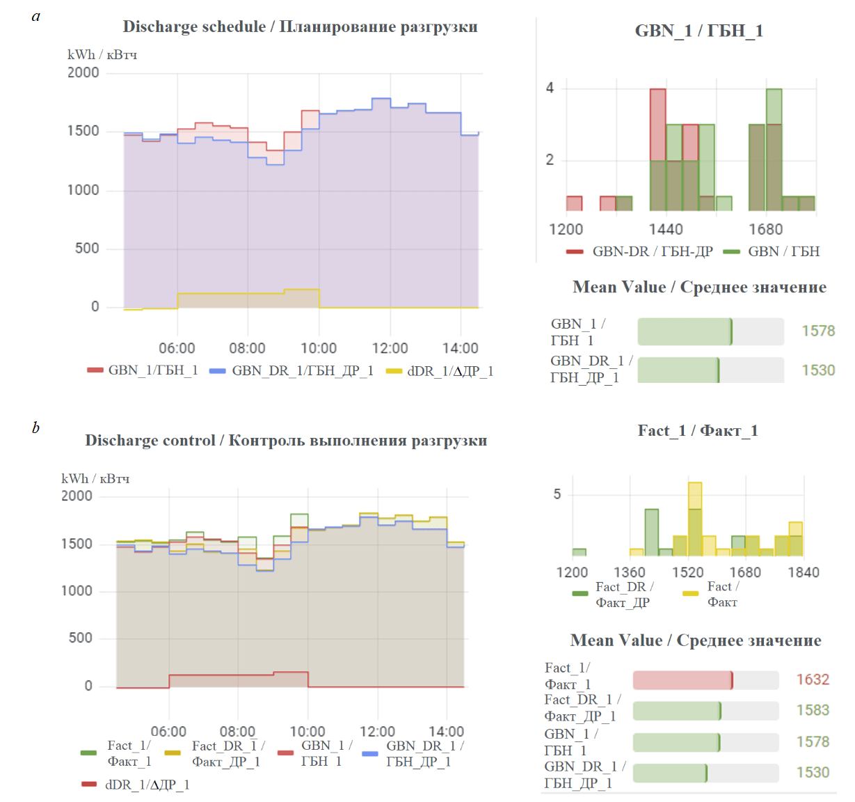 The results of calculations, daily energy consumption forecasting, and a simulation subsystem of a digital twin ventilation system in the OpenModelica environment were jointly integrated with the InfluxData Internet of Things platform based on the TICK technology stack. Instead of the built-in visualization unit, the external Grafana service was used to clearly display energy consumption values in the form of time series. As part of the integration, standard screen forms were implemented for UME demand response specialists, including an example of an operator panel for planning unloading and monitoring plan implementation, including the display of graphs, histograms, and average values (Fig.6).