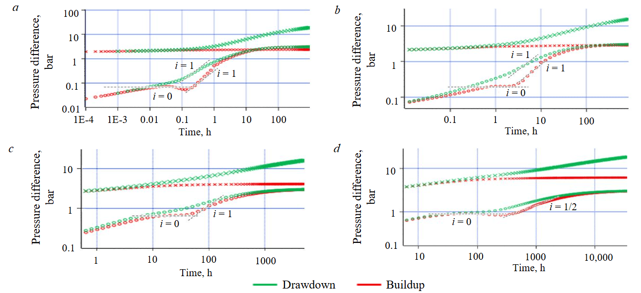 Such features of the derivative behavior are characterized by an interesting phenomenon that occurs for values of Tpr from the specific interval, where a difference in the shape of the buildup derivative compared to the drawdown derivative is observed. Figure 2 shows a comparison of the buildup and drawdown derivatives for the hw cases presented earlier; the buildup derivatives are plotted for different values of Tpr and hw. For all four hw cases, the buildup derivative shows the formation of a horizontal segment followed by a slight dip. Notably, a proximity is observed between the “plateau” of the early radial flow regime on the drawdown derivative and the developing “plateau” on the buildup derivative after a short flow period (Fig.2, d). It can be assumed that for the other cases as well, the appearance of a horizontal segment on the buildup after a short flow period may be a characteristic feature that allows for estimation of reservoir flow capacity without achieving the late radial flow regime.