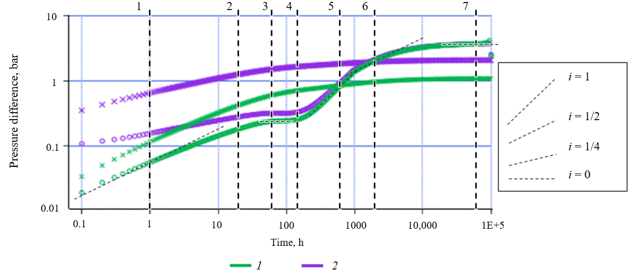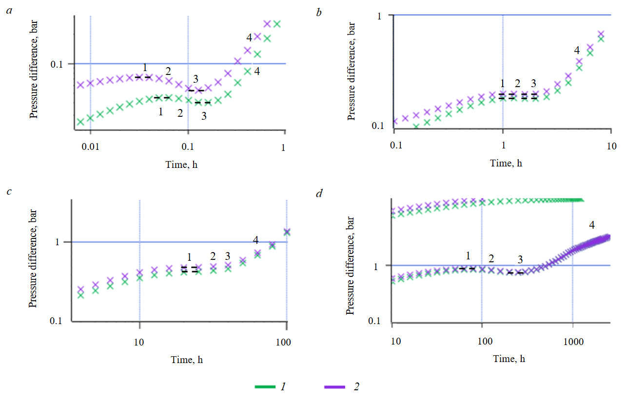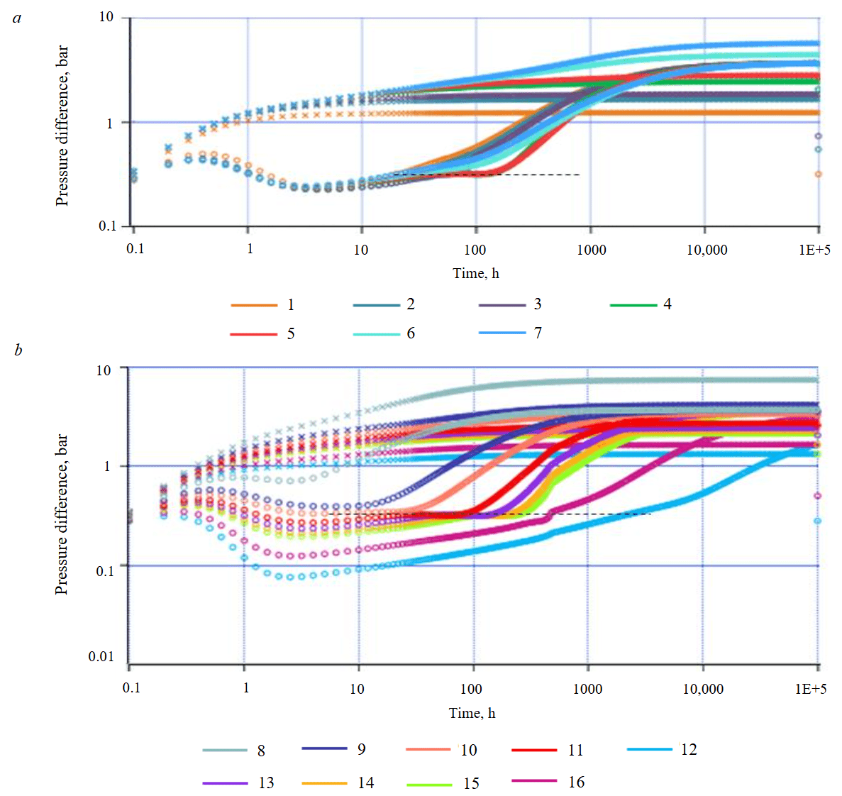 To assess the influence of system compressibility ct, the base case with parameters from Table 3 and production time Tpr of 100 h was used. The compressibility was varied when generating the synthetic curves until all signs of the horizontal segment manifestation disappeared. The range of values covered was 1∙10–6 to 3∙10–3 bar–1 (Fig.3, b). Similar to the production time variation, a change in compressibility does not affect the vertical position of the horizontal segment, the formation of which is observed at the same level. However, since variations in ct affect all temporal characteristics of the pressure buildup curves, not only the duration but also the time of the onset of the horizontal segment changes.