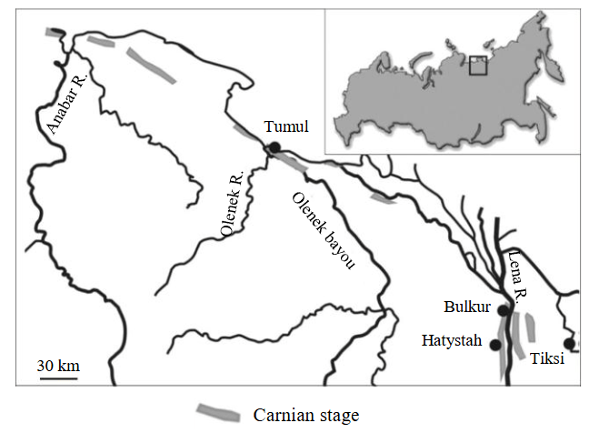 Fig.1. Schematic map of the location of diamond-bearing rocks of the Carnian stage within the northeast of the Siberian craton. The square on the inset – the location of the area.