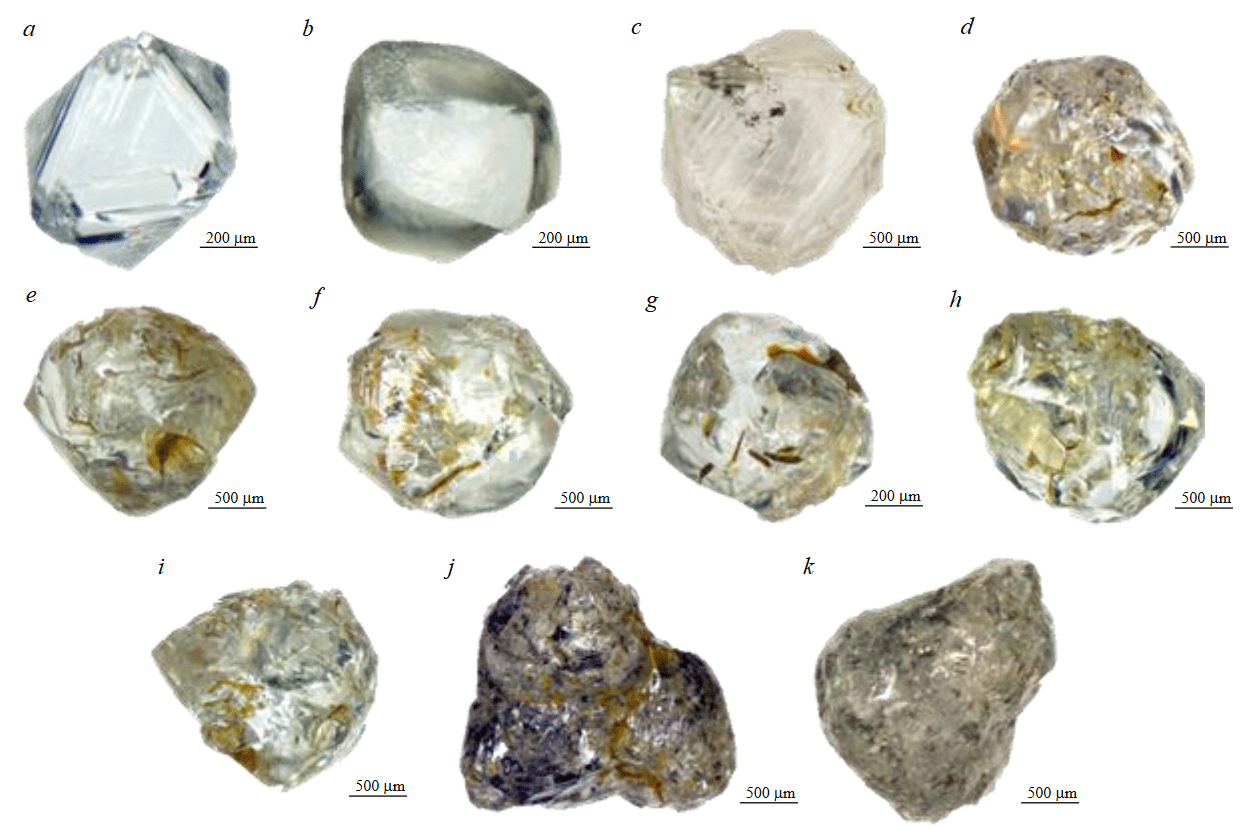 a-с – diamonds of the variety I according to Yu.L.Orlov: a, c – a colorless octahedron with polycentrically growing edges, b – curved dodecahedron; d-i – curved dodecahedron with deep scars on the surface filled with ironification products; j, k – diamonds of V-VII varieties with numerous dark-colored inclusions