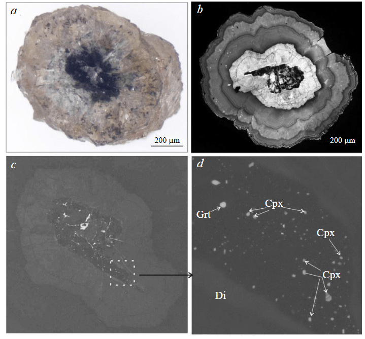 - Ragozin A.L., Zedgenizov D.A., Kuper K.E., Shatsky V.S. Radial mosaic internal structure of rounded diamond crystals from alluvial placers of Siberian platform. Mineralogy and Petrology. 2016. Vol. 110. Iss. 6, p. 861-875. DOI: 10.1007/s00710-016-0456-0