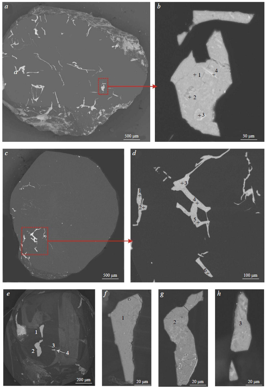 To study mineral inclusions, the crystals were grind in until the inclusion was brought to the surface of the diamond matrix. Identification of some mineral phases was carried out by Raman spectroscopy on a Horiba Jobin-Yvon LabRam HR800 device. The chemical composition of the inclusions was determined using a MIRA 3 scanning microscope (TESCAN, Czech Republic). The phase composition of nanosized polyphase inclusions was studied by transmission electron microscopy (TEM) on a Philips CM200 (LaB6) device at an accelerating voltage of 200 kV [25, 26].