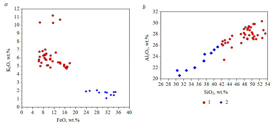 Fig.7. Chemical composition of melt inclusions in Carnian diamonds of various types: a – K2O-FeO; b – Al2O3-SiO2