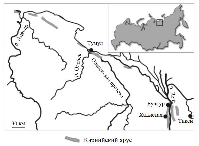 Рис.1. Схематическая карта расположения выхода алмазоносных пород карнийского яруса в пределах северо-востока Сибирского кратона. Квадрат на врезке – расположение района. Схема построена по статье [19]