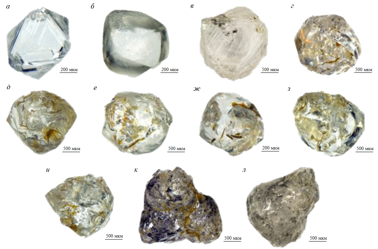 a-в – алмазы I разновидности по Ю.Л.Орлову: а, в – бесцветный октаэдр с полицентрически растущими гранями, б – кривогранный додекаэдроид; г-и – кривогранный додекаэдроид с глубокими шрамами на поверхности, заполненными продуктами ожелезнения; к, л – алмазы V-VII разновидностей с множественными черными включениями