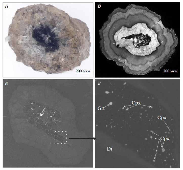 - Ragozin A.L., Zedgenizov D.A., Kuper K.E., Shatsky V.S. Radial mosaic internal structure of rounded diamond crystals from alluvial placers of Siberian platform // Mineralogy and Petrology. 2016. Vol. 110. Iss. 6. P. 861-875. DOI: 10.1007/s00710-016-0456-0