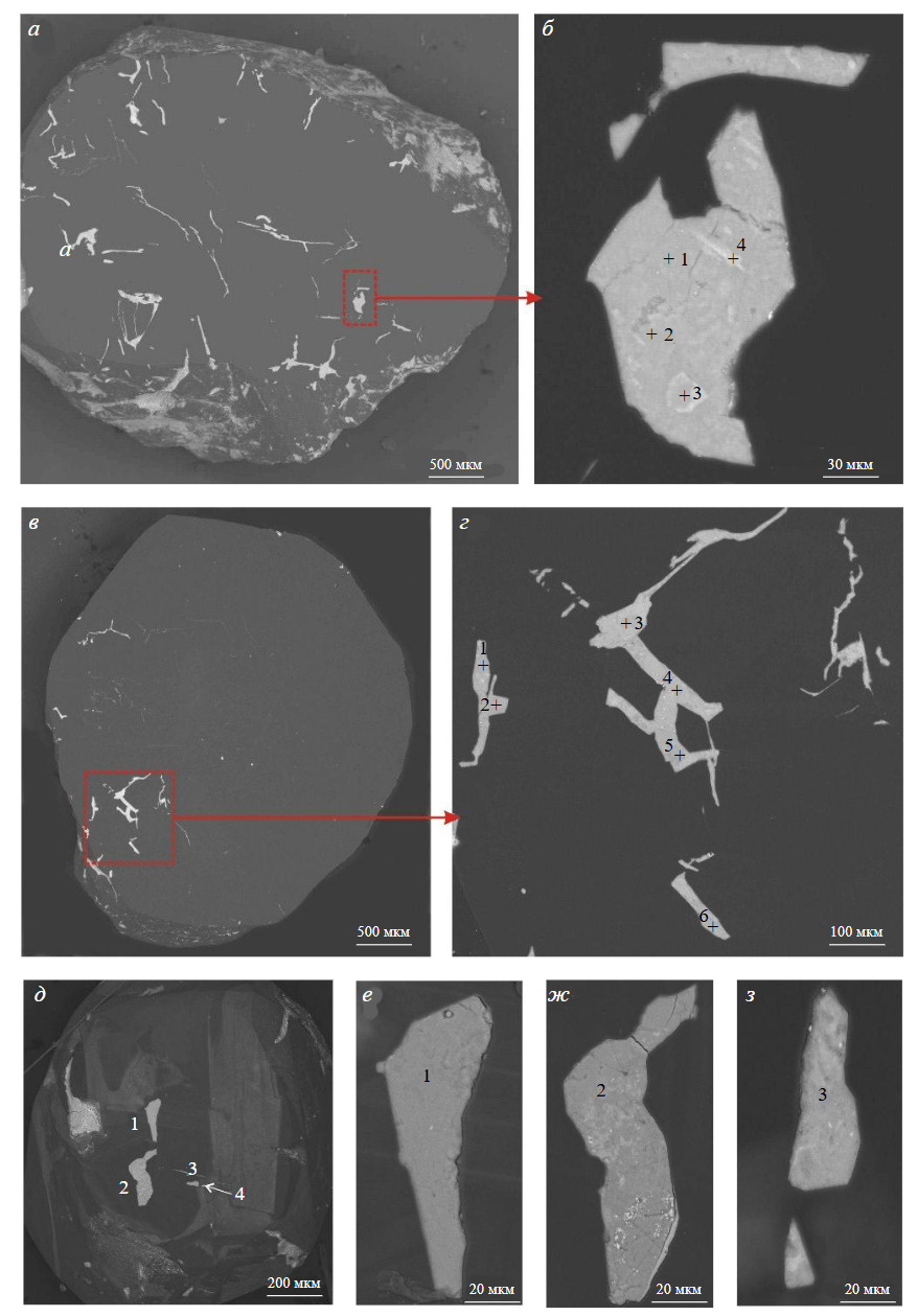 Для исследования минеральных включений кристаллы были пришлифованы до выведения включения на поверхность алмаза-матрицы. Идентификация некоторых минеральных фаз проведена методом рамановской спектроскопии на приборе Horiba Jobin-Yvon LabRam HR800. Химический состав включений определялся с помощью сканирующего микроскопа MIRA 3 (TESCAN, Чехия). Фазовый состав наноразмерных полифазных включений изучен методом просвечивающей электронной микроскопии (ПЭМ) на приборе Philips CM200 (LaB6) при ускоряющем напряжении 200 кВ [25, 26].