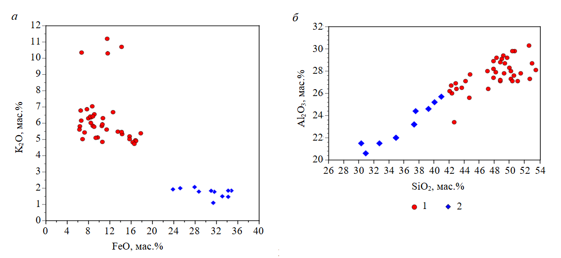 Рис.7. Химический состав расплавных включений в алмазах карнийского яруса разных типов: а – K2O-FeO; б – Al2O3-SiO2