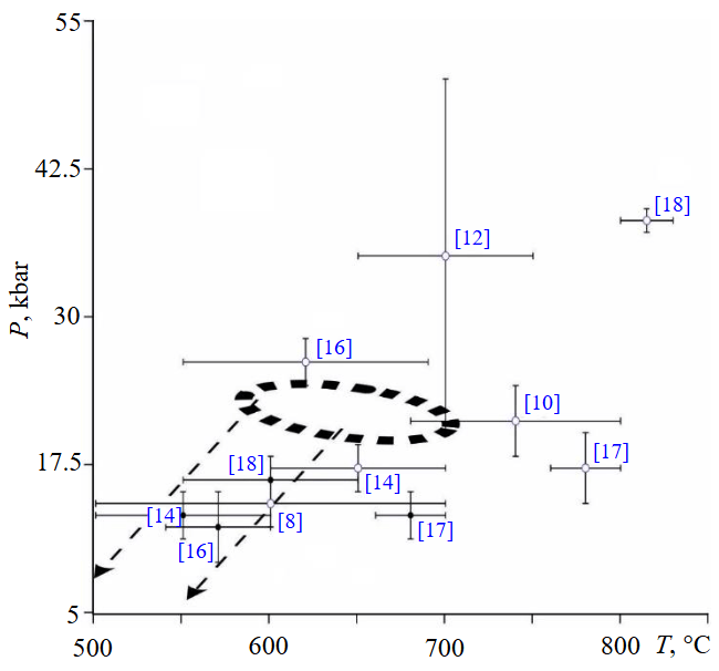 Fig.1. Summary diagram of PT parameters for rocks of the Marun-Keu complex based on published data. White markers are parameters of the “peak” stage, black markers are parameters of the regressive stage of metamorphism. Horizontal and vertical “whiskers” correspond to calculated errors in PT parameters. The area of estimated peak metamorphism parameters is indicated by an ellipse with a dashed boundary. The lines with arrows limit the PT area for the regressive stage of metamorphism