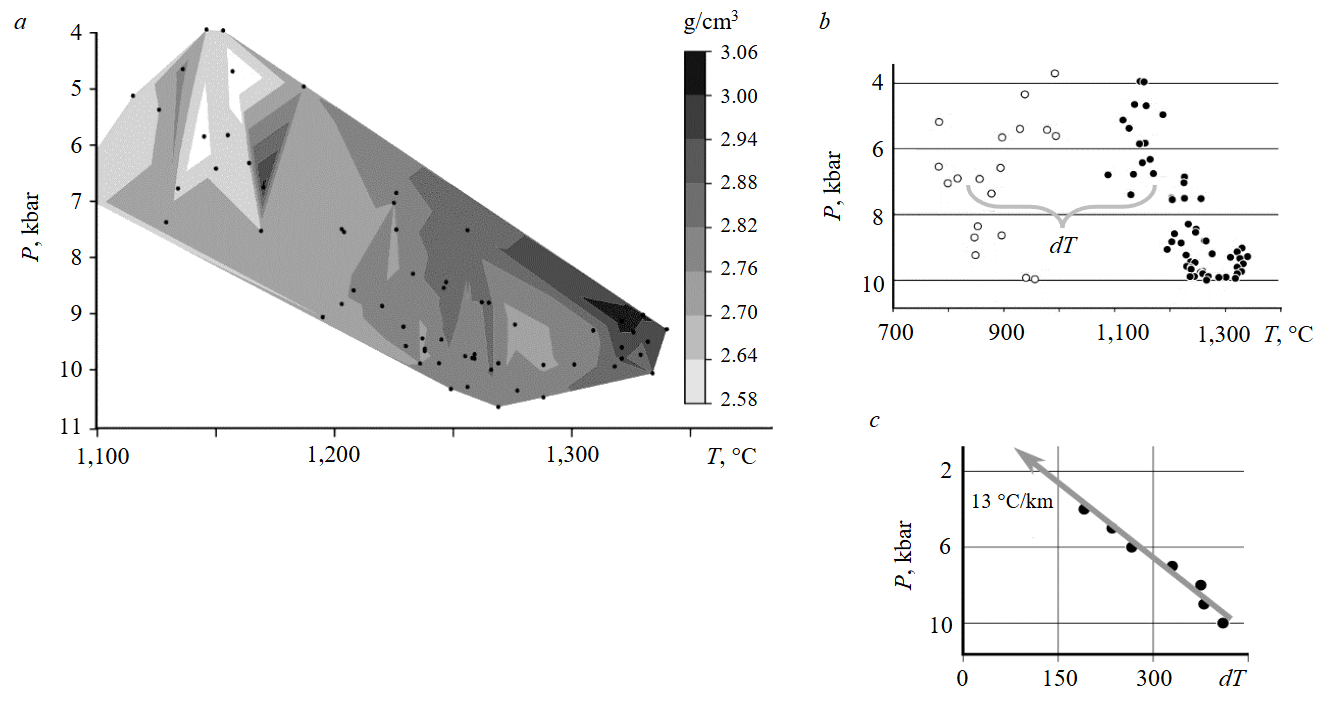 Fig.2. Distribution of eclogite protolith densities in the PT field, the dots show the data for which the calculation was performed (a); the position in the PT space of the calculated parameters for acidic and intermediate rocks (white circles) and ultrabasic rocks (black circles), the gray bracket and the designation dT show the difference in rock crystallization temperatures at the same pressure (b); the estimate of the temperature gradient in Fig.b in the continental crust (Fig.c).