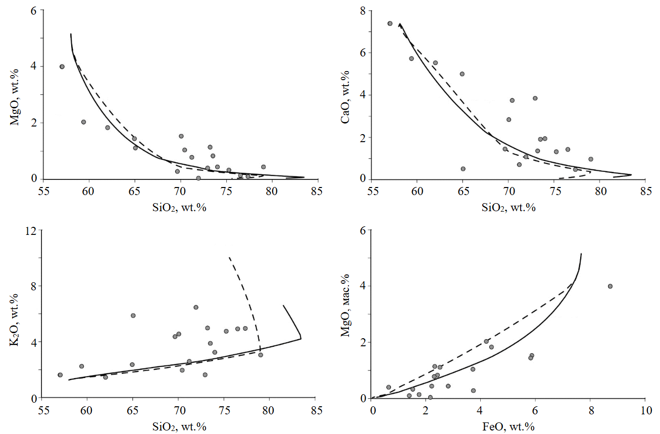 Applying this method to 66 ultrabasic and basic rocks (including eclogites), crystallization temperatures and pressures were estimated to range from 1,340 to 1,100 °C and 10 to 4 kbar, respectively. The average errors for these calculations do not exceed 75 °C for temperature and 2.5 kbar for pressure. Comparison with previous estimates reported by [10] reveals good agreement for pressure (6-8 kbar in [10] versus 6-9 kbar herein) and reasonable concordance for temperature (1,253±15 °C in [10] versus 1,192±37 °C in this study). To calculate the densities of silicate melts as functions of petrogenic oxides (within a 10-component system), pressure, and temperature, we employed the methodology described in [23], implemented in Python. The calculated density errors did not exceed 0.02 g/cm³. To investigate the potential genesis of metamorphosed acidic to intermediate rocks containing eclogites and ultrabasic components, simulations of their formation via partial melting of Precambrian continental crust under the influence of basic-ultramafic melts were conducted using the Rhyolite-MELTS software package [24, 25].
