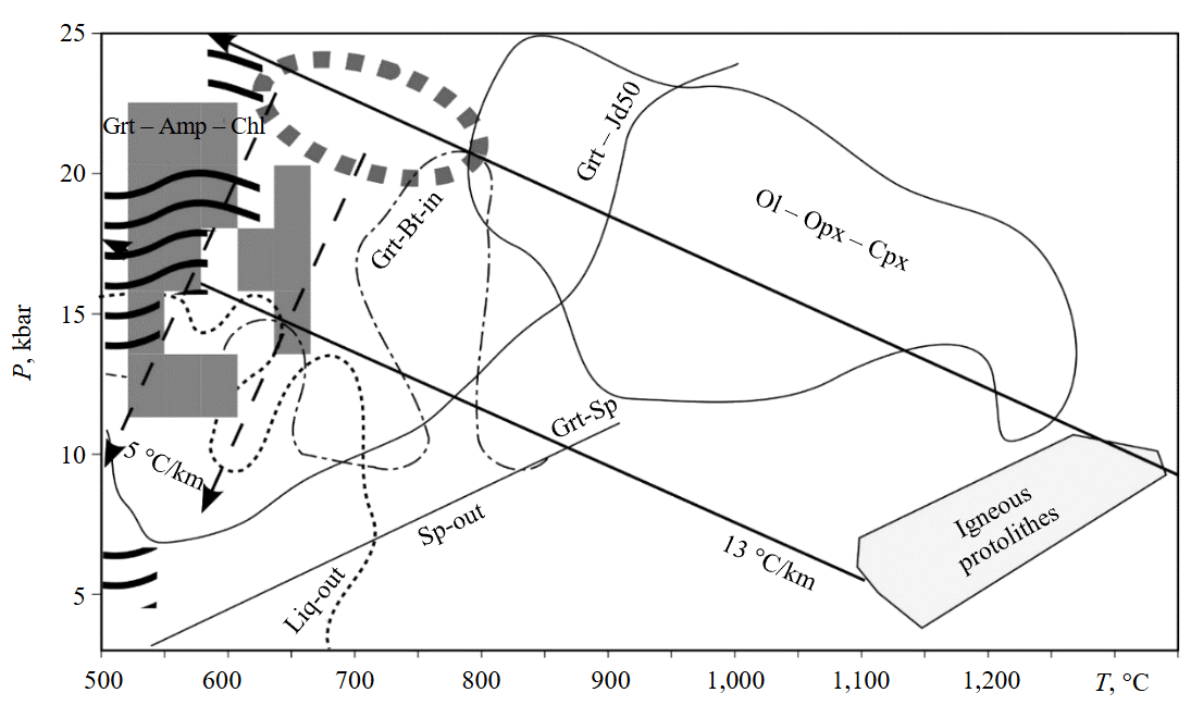 Association: Ol – Opx – Cpx – olivine-orthopyroxene-clinopyroxene (postmagmatic, pre-peak), Grt – Amp – Chl – garnet-amphibole-chlorite (dark gray field), Grt – Jd50 – garnet-omphacite; Grt-Bt-in – boundary of the stability field of the garnet-biotite association (dash-dotted line); Sp-out – stability boundary of spinel inclusions (solid line); Liq-out – approximate boundary of the onset of melting for the rocks of the matrix, including eclogite blocks (dashed line); parageneses with talc (black wavy lines); area of inferred peak parameters of metamorphism (ellipse with gray dotted boundary); calculated gradients: progressive stage (solid lines with arrows), regressive (dashed lines with arrows). The light gray field for the magmatic stage of rock evolution is given according to Fig.2, a