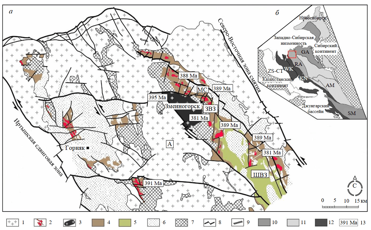 1 – гранитоиды, D2-С2 (объединенные); 2 – субвулканические интрузии риолит-порфиров мельнично-сосновского вулканического комплекса (D1-2); 3 – гранитоиды массива Мохнатые сопки с точкой датирования [20] и контурами предполагаемой магматической камеры эродированного палеовулкана; 4 – мельничная и сосновская вулканические свиты (D1-2); 5 – шипуновская вулканическая свита (D2-3); 6 – прочие вулканические и осадочные комплексы девона (объединенные); 7 – каледонский фундамент Рудного Алтая (S-D1); 8 – разрывные нарушения; 9 – профиль стратотипического разреза на участке Мельничные сопки (МС); 10 – герцинские вулкано-плутонические пояса; 11 – каледонский террейново-орогенный пояс Сибири; 12 – сутурная зона (Иртыш-Зайсанский палеоокеан); А – Алейское поднятие; ЗВЗ – Змеиногорская вулканическая зона, ШВЗ – Шипунихинская вулканическая зона; террейны: GA – Горно-Алтайский; RA – Рудно-Алтайский; KN – Калба-Нарымский; WK – Западно-Калбинский; ZS-CT – Жарма-Саурский и Чингиз-Тарбагатайский; AM – Алтае-Монгольский; SM – Южно-Монгольский; 13 – ранее изученные вулканические центры с точками датирования [17]