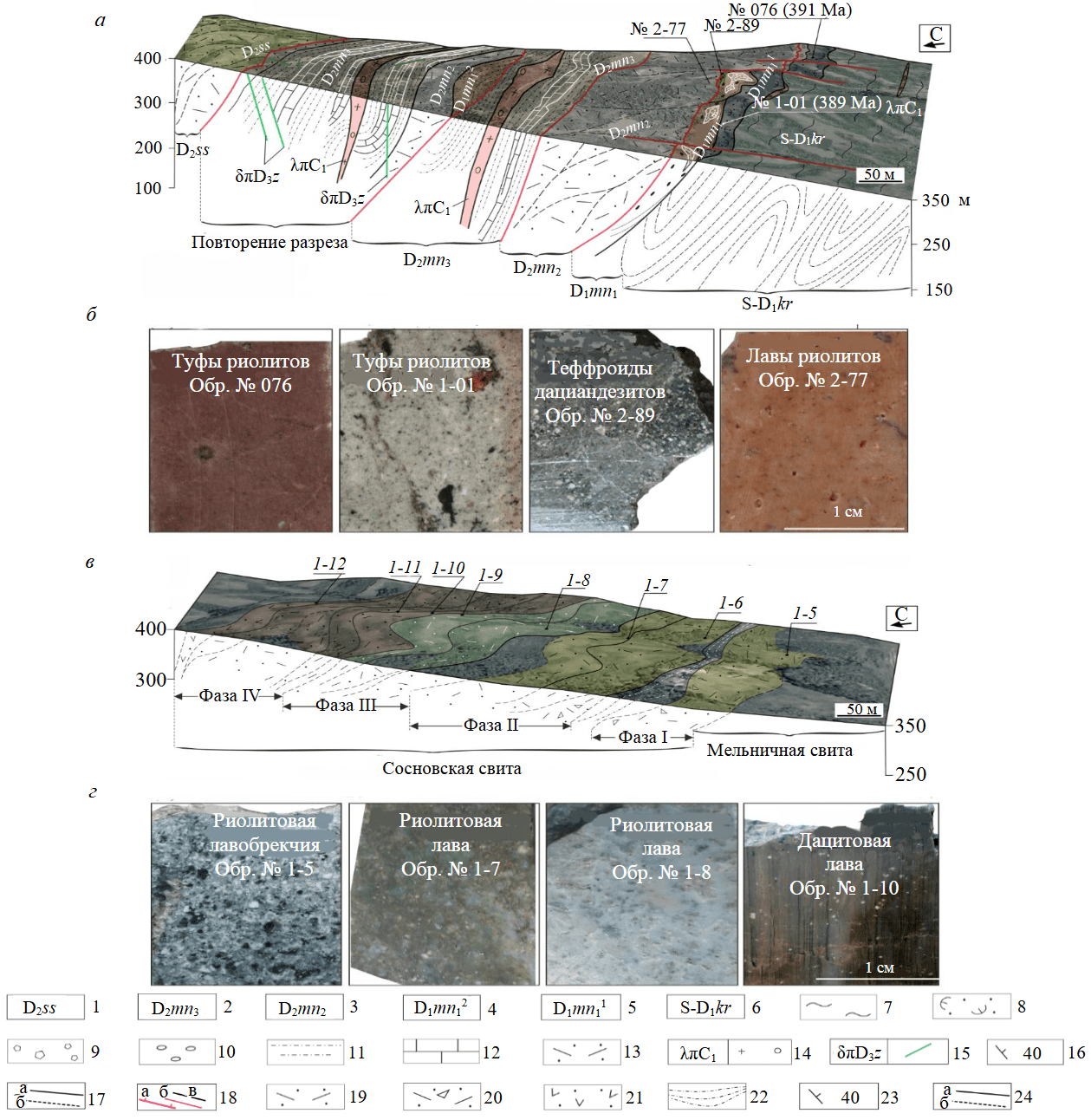 Рис.2. Теневая модель рельефа участка Мельничные сопки с вынесенными контурами геологических тел мельничной свиты, подсвеченная с запада (а) с представительными фотографиями образцов мельничной свиты S-D1kz (б) и с вынесенными контурами геологических тел сосновской свиты, подсвеченной с запада (цифрам соответствуют точки отбора проб из лавовых потоков) (в) с представительными фотографиями образцов сосновской свиты (г)