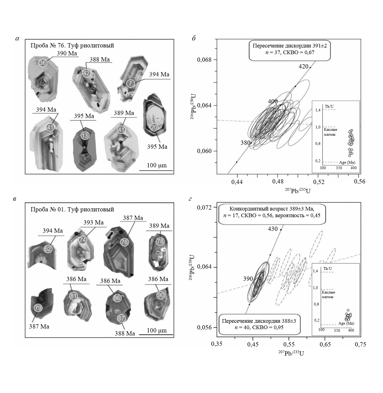 В пробе № 01 зерна бледно-желтой окраски, алмазного блеска, дипирамидального габитуса (k = 0,7-2,8 при среднем значении 1,4) с узкой осцилляторной зональностью. Выполнено 40 определений возраста в 35 зернах циркона в течение одной измерительной сессии. Изотопный возраст, полученный по пересечению дискордии с линией равных возрастов по 14 зернам цирконов с суммарным количеством точек датирования – 17, ~ 389 млн лет. Полученные результаты по двум пробам согласуются с ранее полученными изотопными U-Pb-данными возрастов для субвулканических риолитов мельнично-сосновского вулканического комплекса [20].