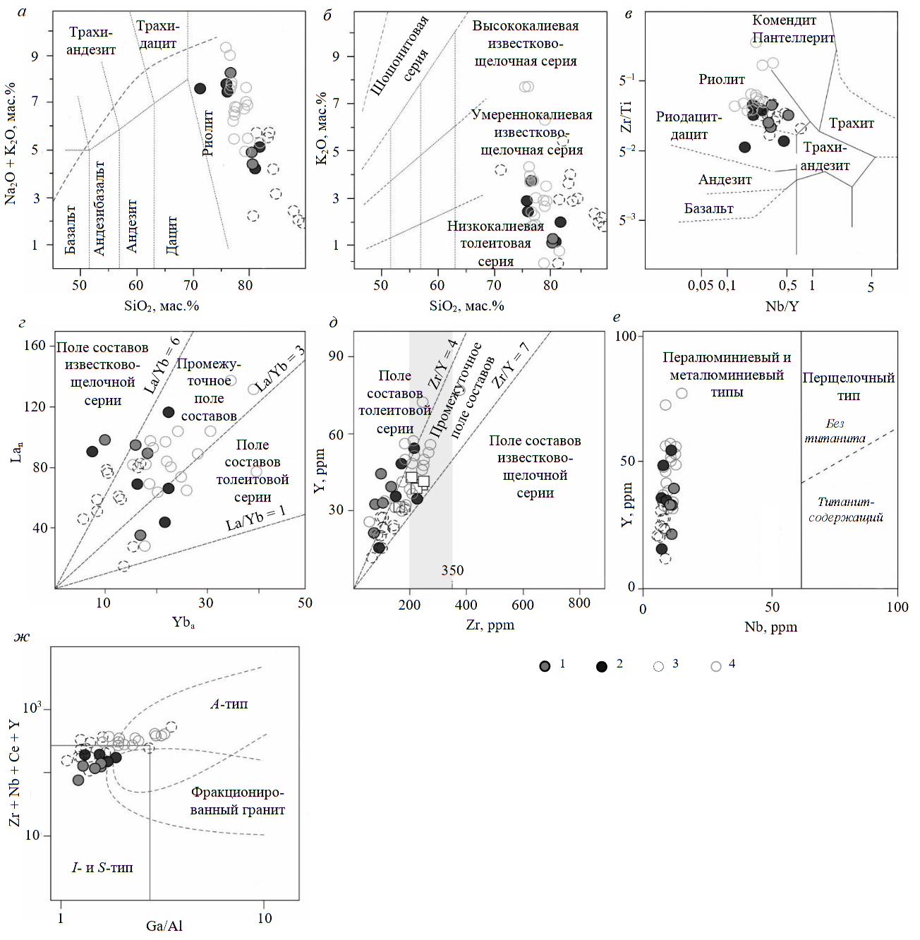 Рис.4. Геохимическая классификация пород кислого ряда: SiO2–(Na2O+K2O) (а); SiO2–K2O [26, 27] (б); Nb/Y–Zr/Ti [28] (в); Yba–Lan (г); Zr–Y [5, 29] (д); Nb–Y [29] (е); Ga/Al–(Zr+Nb+Ce+Y) [30] (ж)